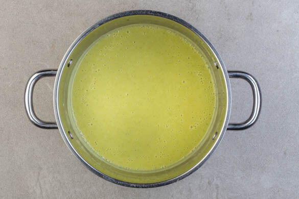 Den Lauch in einem mittelgroßen Topf mit 1EL Butter und 1 Prise Salz bei mittlerer Hitze in 1–2Min. glasig anbraten. 600ml Wasser angießen. Sobald das Wasser heiß ist, die ½ des Brühgewürzes zugeben und auflösen. Die Kartoffeln dazugeben und einmal aufkochen, dann die Hitze reduzieren und alles abgedeckt bei mittlerer Hitze ca. 20Min. köcheln lassen, bis die Kartoffeln weich sind.