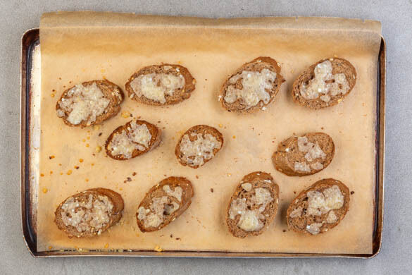 Den Backofen mit Grillfunktion oder Ober-/Unterhitze auf 250°C vorheizen. Das Brötchen in ca. 1cm breite Scheiben schneiden und auf ein mit Backpapier ausgelegtes Backblech legen. Im vorgeheizten Backofen in ca. 2Min. goldbraun rösten. Die Crostini wenden, mit dem Käse bestreuen und weitere 2Min. rösten, bis der Käse geschmolzen ist, dann aus dem Ofen nehmen.