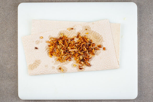 Die Blumenkohl-Hähnchen-Pasta auf tiefe Teller verteilen, mit dem restlichen Käse, den Röstzwiebeln und den Dillspitzen garnieren und servieren.