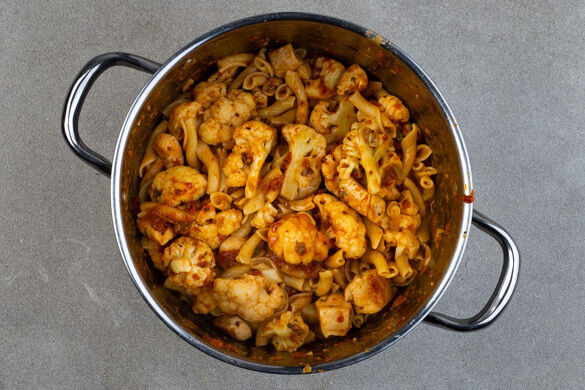 Die Sauce mit der Pasta und dem Blumenkohl im Topf vermengen, dabei nach Bedarf esslöffelweise Pastawasser zugeben, bis die Pasta vollständig mit der Sauce bedeckt ist. Mit Salz und Pfeffer abschmecken.