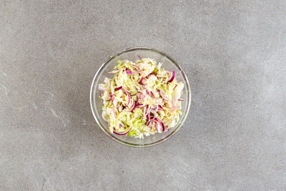 Die Limetten halbieren und auspressen. Die ½ des Limettensafts mit 2EL Essig und 1 kräftigen Prise Salz verrühren. Die Zwiebeln schälen, halbieren und in dünne Streifen schneiden. Den Weißkohl mit den Zwiebeln vermengen, dann den gewürzten Limettensaft mit den Händen einmassieren.