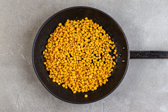 Den Backofen auf 220°C (200ºC Umluft) vorheizen. Den Mais in ein Sieb abgießen, abtropfen lassen und in einer mittelgroßen Pfanne mit 1EL Olivenöl und 1 kräftigen Prise Salz bei starker Hitze 3–5Min. scharf anbraten, bis sich deutliche Röstspuren abzeichnen. Den Mais herausnehmen und beiseitestellen, die Pfanne aufbewahren.