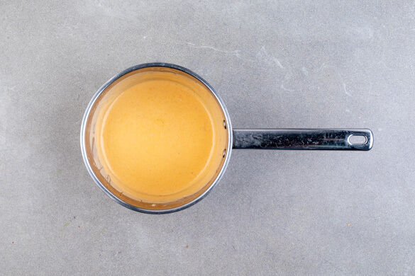 Die Erdnussbutter mit der ½ des Sambal Badjak, 1TL Essig, 1 kräftigen Prise Zucker und 1 Prise Salz in einem kleinen Topf verrühren. Die ½ der Kokosmilch dazugeben. Bei mittlerer Hitze unter Rühren zum Kochen bringen und 5–7Min. sanft köcheln lassen. Den Topf vom Herd nehmen.