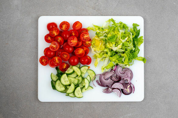 Aus 1EL Olivenöl, 1–2TL Essig und der restlichen Gewürzmischung ein Dressing anrühren und mit den Tomaten, den Salatstreifen, den Gurken und den Zwiebeln vermengen.