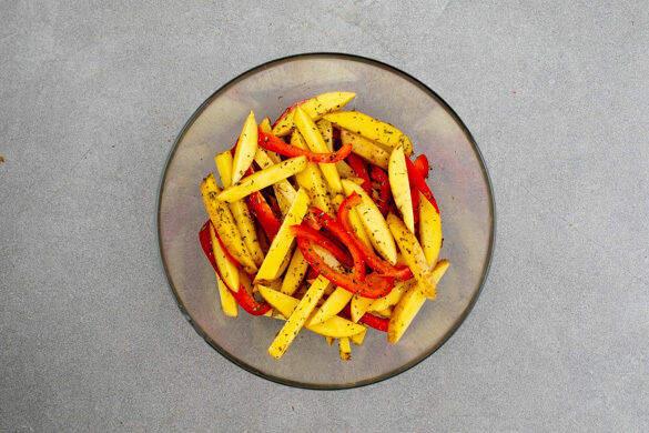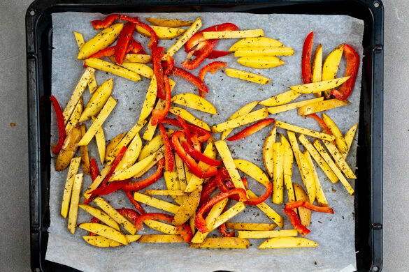 Den Backofen auf 220°C Umluft (240°C Ober-/Unterhitze) vorheizen. Die Kartoffeln samt Schale in lange, pommesartige Stifte schneiden. Die Paprika vierteln, entkernen und in dünne Streifen schneiden. Die Kartoffeln und die Paprika mit 1–2EL Olivenöl, der 1/2 der Gewürzmischung und 1 kräftigen Prise Salz und Pfeffer vermengen.