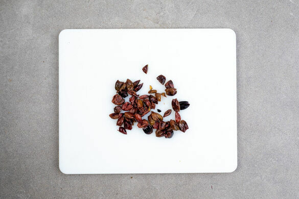 Die Kirschtomaten halbieren. Die Gurke längs halbieren und quer in dünne Scheiben schneiden. 1 Romanasalatherz quer in dünne Streifen schneiden. Tipp: Wer mag, kann mehr Salat verwenden oder bewahrt den Salat für ein anderes Rezept auf. Die Zwiebel schälen, halbieren und in feine Ringe schneiden.
