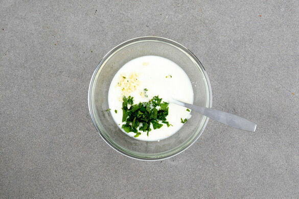 Die Minzeblätter abzupfen und fein schneiden. Den Knoblauch schälen und die 1/2 des Knoblauchs oder nach Geschmack mehr sehr fein würfeln oder reiben. Den Joghurt mit der Minze und dem Knoblauch verrühren und den Dip mit Salz abschmecken.