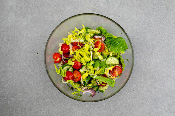 Aus 1–2EL Olivenöl, 1–2TL Essig und der restlichen Gewürzmischung ein Dressing anrühren und mit den Tomaten, den Salatstreifen, den Gurken und den Zwiebeln vermengen.