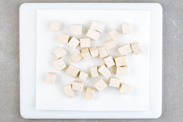 Den Tofu trocken tupfen, in 1–2cm große Würfel schneiden, in ein sauberes Küchentuch einschlagen und mit einem Teller oder einer Pfanne beschweren, um die Flüssigkeit auszupressen.with test