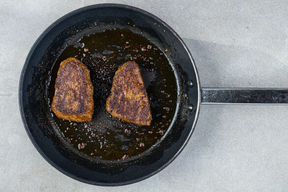 Das Fleisch trocken tupfen und von beiden Seiten mit der Gewürzmischung sowie je 1 Prise Salz und Pfeffer würzen. In einer großen Pfanne mit 1–2EL Olivenöl bei starker Hitze auf jeder Seite 1–2Min. scharf anbraten, bis das Fleisch medium durch ist. In Alufolie gewickelt ruhen lassen. Tipp: Wer das Fleisch lieber durchgebraten mag, gart es pro Seite ca. 3Min.