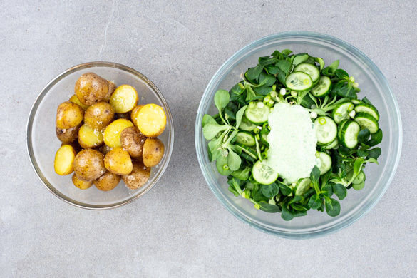 In einem mittelgroßen Topf ausreichend gesalzenes Wasser für die Kartoffeln zum Kochen bringen. Die Kartoffeln halbieren, in das kochende Wasser geben und in 15–17Min. bissfest kochen.