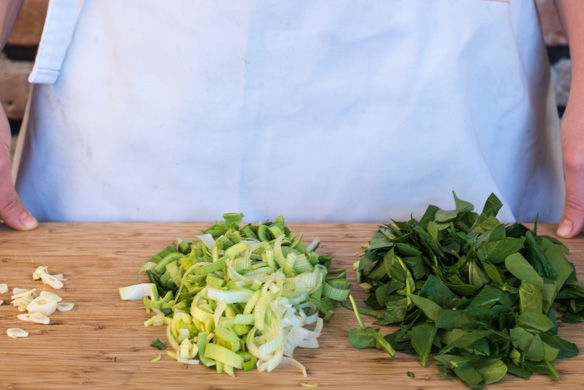 Den Spinat mit einem Messer grob hacken. Den Lauch der Länge nach halbieren und in feine Streifen schneiden. Den Knoblauch schälen und in dünne Scheibchen schneiden.