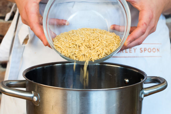In einem mittleren Topf 450ml Wasser, das Tomatenmark, die 1/2 des Brühgewürzes und 1 Prise Salz verrühren. Die Risoni, 2EL Olivenöl und 1 Prise Zucker hinzufügen, einmal aufkochen lassen und bei geringer Hitze unter gelegentlichem Rühren 7–10Min. köcheln lassen, bis die Nudeln bissfest sind. Vom Herd nehmen, mit Salz und Pfeffer und ggf. dem restlichen Brühgewürz abschmecken.