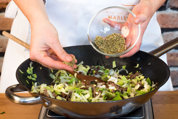 Das Hackfleisch in einer großen Pfanne mit 1–2EL Olivenöl bei mittlerer Hitze 5–7Min. krümelig anbraten. Während der letzten 2Min. den Lauch und den Knoblauch dazugeben und mitbraten. Mit Salz, Pfeffer und der Gewürzmischung nach Geschmack würzen. Die Pfanne vom Herd nehmen und die Hackfleisch-Lauch-Mischung warm halten.