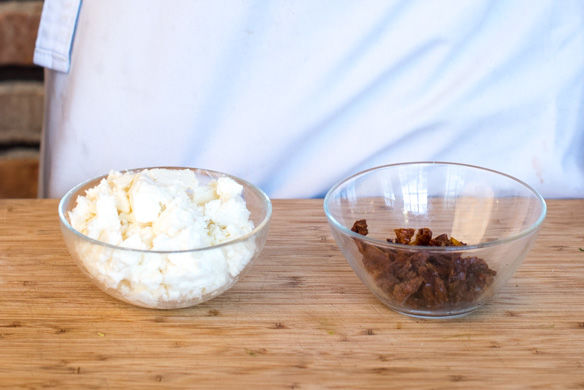 Die 1/2 des Fetas mit den Fingern oder einer Gabel zerkrümeln. Tipp: Mit dem restlichen Feta den nächsten Salat verfeinern. Die getrockneten Tomaten abtropfen lassen und klein schneiden.
