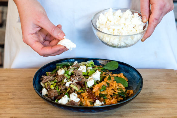 Die herzhafte Hackfleisch-Lauch-Pfanne wird mit leckeren Risoni serviert, die mit Tomatenmark gekocht und mit zartem Babyspinat verfeinert werden. Dazu gibt es cremig-salzigen Fetakäse und getrocknete Tomaten, die dem Gericht eine mediterrane Note verleihen. Da fühlt man sich fast schon wieder wie im Urlaub – und wird so richtig schön satt.