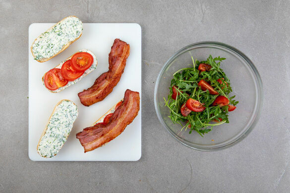 Die Brötchen aufschneiden und mit der Rucolacreme bestreichen. Mit den Tomatenscheiben und dem Speck belegen. Die Tomatenspalten mit dem restlichen Rucola, 1EL Olivenöl, 1EL Essig (z. B. Balsamico) sowie 1 Prise Salz und Pfeffer vermengen und die Sandwiches mit den Ofenkartoffeln, dem Salat und ggf. restlicher Rucolacreme servieren.