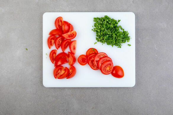 1 Tomate in dünne Spalten, die übrige Tomate in dünne Scheiben schneiden. Die 1/2 des Rucolas grob hacken.