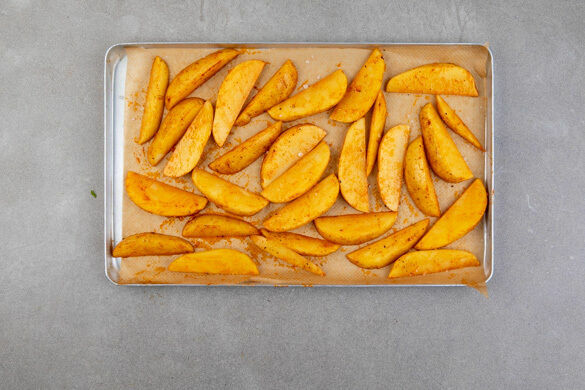 Den Backofen auf 220°C Umluft (240°C Ober-/Unterhitze) vorheizen. Die Kartoffeln samt Schale in Spalten schneiden. Auf einem mit Backpapier ausgelegten Backblech mit 1–2EL Olivenöl, 1 kräftigen Prise Paprikapulver sowie Salz und Pfeffer vermengen, gleichmäßig verteilen und ca. 20Min. im Ofen backen, bis die Kartoffeln goldbraun und gar sind.