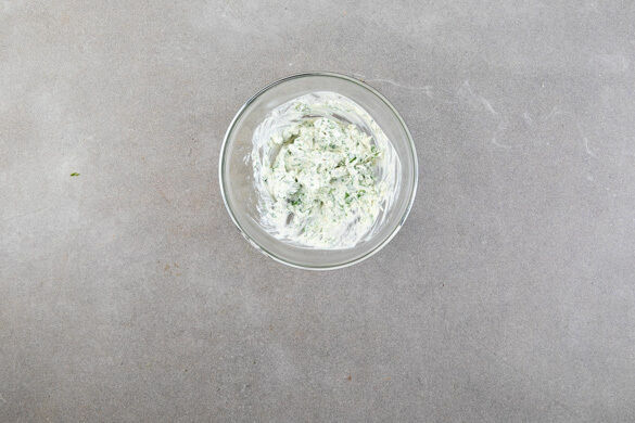 Den Knoblauch schälen und sehr fein würfeln oder durch eine Knoblauchpresse drücken. Den Frischkäse mit dem gehackten Rucola und dem Knoblauch verrühren und die Rucolacreme mit Salz und Pfeffer abschmecken.