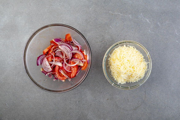 Während der Blumenkohl gart, die Tomaten halbieren und in dünne Spalten schneiden. Die Zwiebel schälen, halbieren und in feine Streifen schneiden. 2EL Olivenöl, 2EL Essig, ½EL Senf sowie je 1 kräftige Prise Zucker, Salz und Pfeffer zu einem Dressing verrühren und die Tomaten und Zwiebelstreifen untermengen.