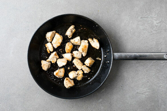 Nebenher das Fleisch trocken tupfen und in einer zweiten großen Pfanne mit 1–2EL Pflanzenöl bei mittlerer Hitze 2–3Min. anbraten, dabei nicht rühren. Erst dann die Fleischstücke wenden und weitere 2–3Min. ohne Rühren. So bekommt das Fleisch eine schöne goldbraune Farbe. Mit Salz und Pfeffer würzen und unter weiterem Rühren noch 1–2Min. braten, dann warm halten.