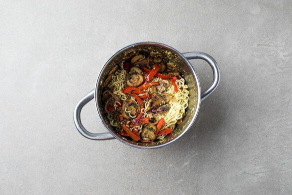 In einem großen Topf ausreichend gesalzenes Wasser für die Nudeln zum Kochen bringen. Die Pilze in einer großen Pfanne mit 1EL Pflanzenöl bei starker Hitze 3–4Min. anbraten, bis die Pilze leicht bräunen. Die Paprika hinzugeben und ca. 2Min. mitbraten, dann die Zwiebeln zugeben und ebenfalls unter gelegentlichem Rühren ca. 2Min. mitbraten.