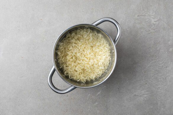 3/4 der Nudeln in das kochende Wasser geben und in 3–5Min. bissfest kochen. Mit einer Tasse etwas Nudelwasser abschöpfen, dann in ein Sieb abgießen, kalt abschrecken und wieder in den Topf geben. Tipp: Wer mag, kann auch mehr Nudeln verwenden.