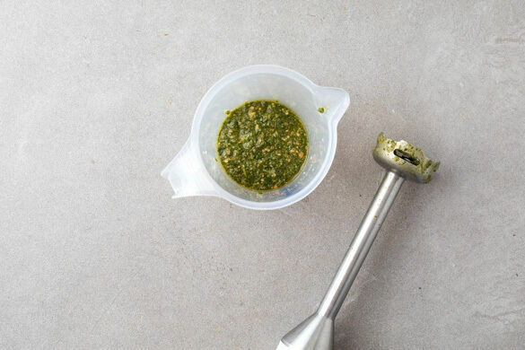 Die Thai-Basilikumblätter abzupfen und ca. 2/3 der Blätter mit dem Knoblauch, den Peperonihälften, der 1/2 der Erdnüsse, dem Sesamöl, 1EL Sojasauce, 1 Prise Salz und 1/2TL Pfeffer in einem hohen Gefäß zu einem glatten Pesto pürieren.