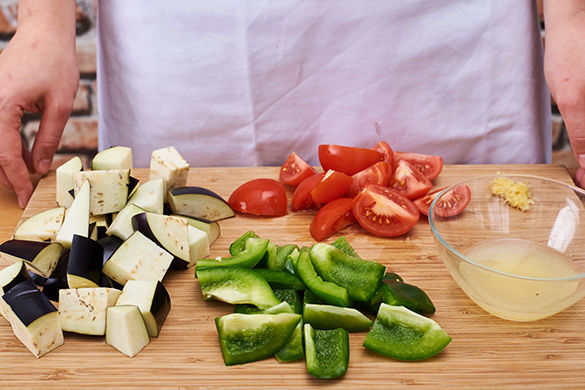 Einen Topf mit 300ml Wasser zum Kochen bringen. Den Ofen auf 200°C Umluft vorheizen. Die Paprika vierteln und das Kerngehäuse entfernen. Nun die Aubergine und die Paprika in ca. 2-3cm große Stücke schneiden. Die Schale der Zitrone abraspeln und den Saft auspressen. Die Tomaten vierteln und den Strunk entfernen.