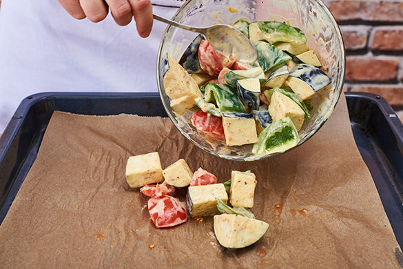 Ein Backblech mit Backpapier belegen, das Gemüse darauf verteilen und im Ofen für 20-25Min. garen bis das Gemüse weich und leicht gebräunt ist.