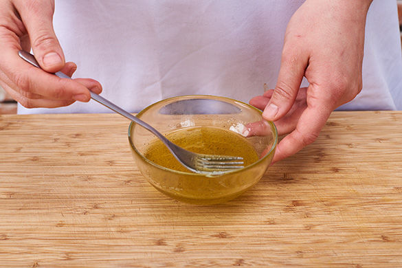 In einer Schüssel den Balsamico-Essig, Knoblauch, 4EL Öl, Salz und Pfeffer zu ein Dressing verrühren.