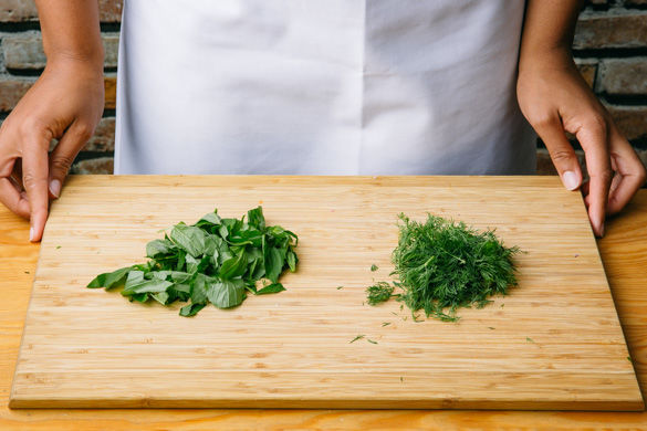 Während die Pasta kocht, den Dill und den Basilikum von den harten Stängeln zupfen und grob hacken.