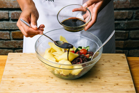 Nun die Pasta mit den Käutern, den Gurkenstücken, den Tomaten, den Oliven und dem Dressing vermischen. Je nach Geschmack mit weiterem Salz und Pfeffer kräftig abschmecken.