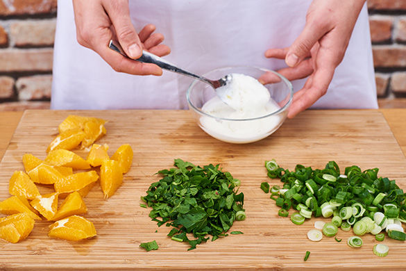 Inzwischen die Schale der Orangen rundherum abschneiden. Dabei auch das weiße Bittere entfernen. Die Orangen nun in ca. 2-3cm große Stücke schneiden. Die Lauchzwiebeln in feine Röllchen schneiden. Die Petersilie von den Stängeln zupfen und grob hacken. Den restlichen Joghurt mit 1TL Zitronenabrieb, Salz und Pfeffer cremig rühren.