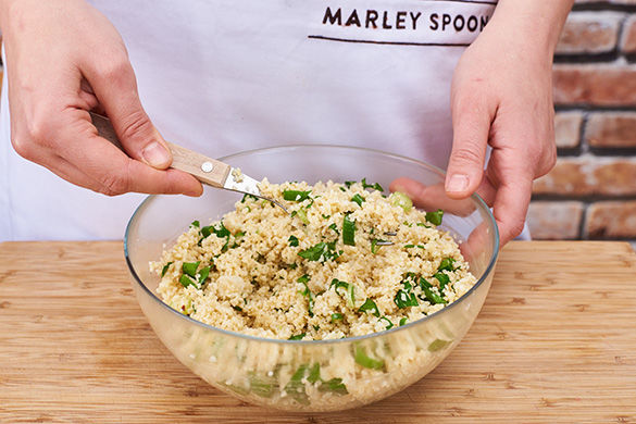 Wir kochen Bulgur: Der im Orient beliebte Hartweizen enthält nicht nur wichtige Ballaststoffe, er passt auch so wunderbar zu dem gerösteten Gemüse. Das schwenken wir vorher in einer Marinade aus Joghurt und orientalischen Gewürzen. So fühlen sich nicht nur die Kleinsten wie Prinzen und Prinzessinnen.