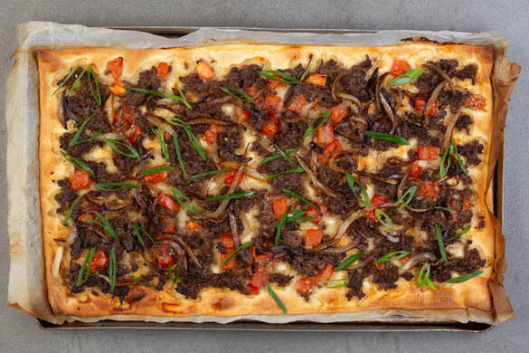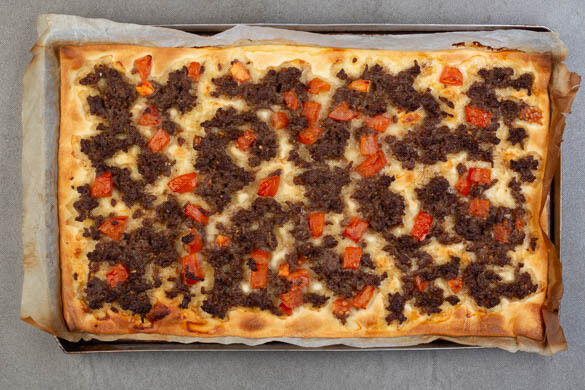 Den Teig mit dem Papier nach unten auf einem Backblech ausrollen und die Hackmischung gleichmäßig darauf verteilen, dabei ca. 1cm Rand frei lassen. Den Flammkuchen im Ofen 9–12Min. backen, bis der Teig an den Rändern leicht knusprig und in der Mitte durchgebacken ist.