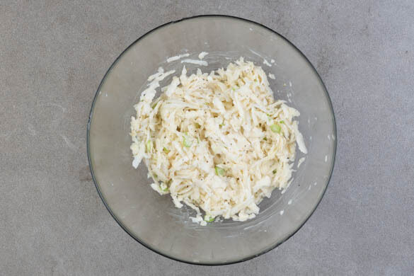 ½EL Zucker und je 1 kräftige Prise Salz und Pfeffer in 2EL hellem Essig auflösen. Den Sellerie schälen und grob reiben, dann die Essigmischung einmassieren, damit der Sellerie weicher wird. Den grünen und weißen Teil der Lauchzwiebel getrennt in dünne Ringe schneiden, die weißen Lauchzwiebelringe mit 2EL Mayonnaise unter den Sellerie mischen.