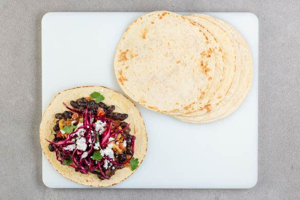Die Bohnen auf den Tortillas verteilen, dann die Eier-Tomaten-Mischung gefolgt von dem Rotkohlsalat darauf anrichten und den Feta mit den Fingern darüber zerkrümeln. Mit dem restlichen Koriander garnieren und servieren.