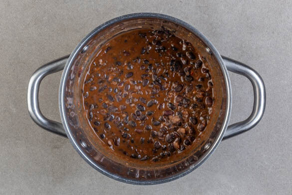 Die Bohnen samt Flüssigkeit mit der Gewürzmischung in einem mittelgroßen Topf bei mittlerer Hitze zum Kochen bringen. Dann bei niedriger Hitze 8–10Min. einköcheln lassen, bis etwa die Hälfte der Flüssigkeit verdampft ist, dabei gelegentlich umrühren. Die Bohnen im Topf grob zerdrücken und mit Salz und Pfeffer abschmecken.