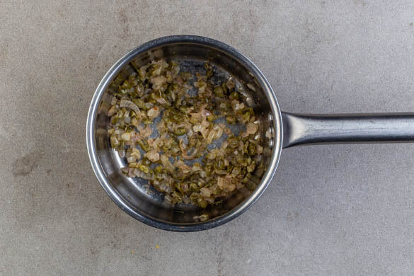 In einem kleinen Topf ½EL Butter bei mittlerer Hitze schmelzen. Die Schalotten in den Topf geben und ca. 1Min. anschwitzen, bis sie glasig und leicht gebräunt sind. Die Kapern hinzugeben und ca. 1Min. erwärmen.