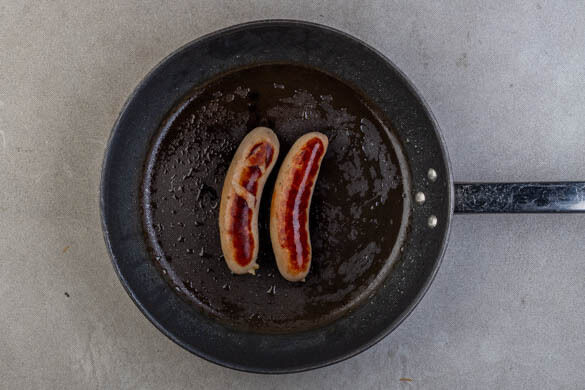 ½EL Olivenöl in einer mittelgroßen Pfanne bei mittlerer bis starker Hitze erwärmen, dann die Würste in die Pfanne geben und in 8–10Min. abgedeckt gar braten, dabei regelmäßig wenden.