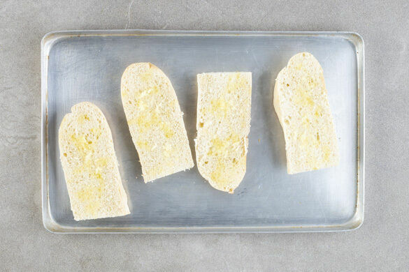 Die Brötchen aufschneiden, einmal quer halbieren und mit den Schnittflächen nach oben auf ein Backblech legen. Den restlichen Knoblauch auf den Brötchen verteilen. Die Brötchen mit insgesamt 1–2TL Olivenöl beträufeln und 7–10Min. im Ofen goldbraun und knusprig rösten.