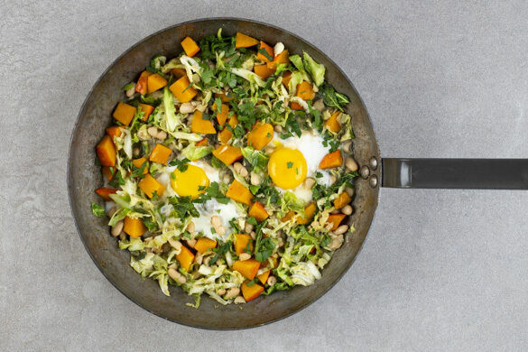 Die Shakshuka ist ein beliebtes Gericht der levantinischen Küche. Ein wahrhaft vielseitiges noch dazu, denn mit leckerem Wirsing, Kürbis und Cannellinibohnen passt sich der Gemüseauflauf mir nichts, dir nichts den jahreszeitlichen Gegebenheiten an. Frischer Salbei und orientalische Gewürze verfeinern das raffinierte Veggie-Mahl, dazu gibt es knuspriges Knoblauchbaguette. Guten Appetit!