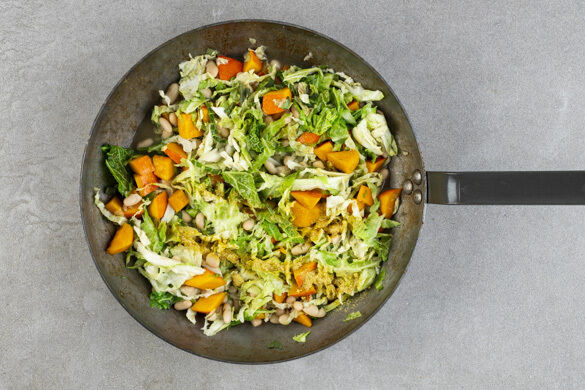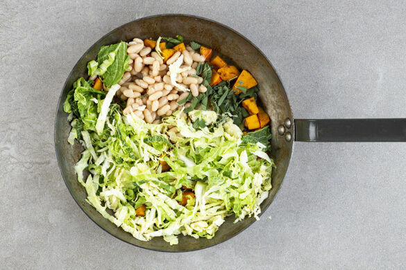 Die 1/2 des Wirsings in feine Streifen schneiden, harte Strunkteile entfernen. Die Salbeiblätter abzupfen und grob schneiden. Den Wirsing, den Salbei und die Cannellinibohnen samt Flüssigkeit zum Kürbis in die Pfanne geben und alles unter Rühren ca. 1Min. anbraten.