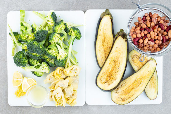 Den Backofen auf 200°C Umluft (220°C Ober-/Unterhitze) vorheizen. Die Zitronenschale abreiben, eine Zitronenhälfte in Spalten schneiden, die andere Hälfte auspressen. Den Brokkoli samt Strunk in längliche, ca. 3cm große Röschen schneiden. Die Artischocken abgießen und halbieren. Die Bohnen abgießen. Die Aubergine längs in 4 je 1–2cm breite Scheiben schneiden.