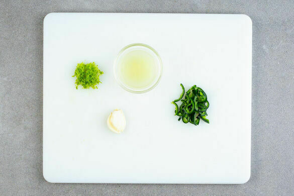 Den Backofen auf 250°C (230°C Umluft) vorheizen. Den Knoblauch schälen. Die Jalapeño längs halbieren, entkernen und in dünne Streifen schneiden. Die Limettenschale abreiben, dann die Limetten halbieren und auspressen.