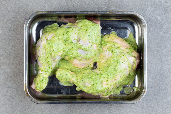 Die Hähnchenschenkel trocken tupfen und die Haut 2–3-mal leicht einritzen, in eine Auflaufform legen und rundherum mit je 1/2TL Salz und Pfeffer würzen. 3/4 der Mojo auf dem Fleisch verteilen, dann im Ofen 30–35Min. backen, bis das Fleisch gar ist. Etwa 10Min. vor Ende der Garzeit die restliche Mojo auf dem Fleisch verteilen und ggf. ausgetretenen Bratensaft darübergießen.