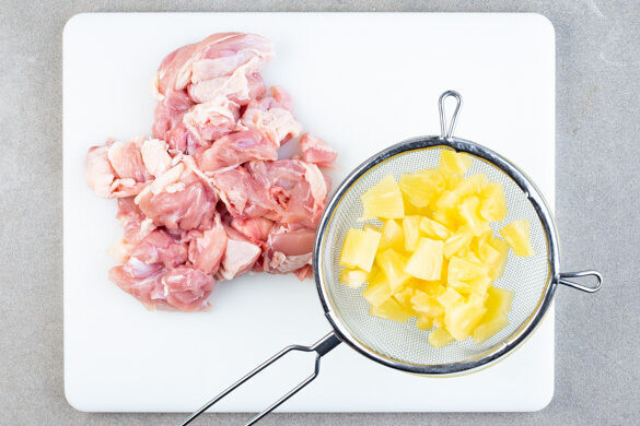 Den Backofen auf 210°C (190°C Umluft) vorheizen. Das Fleisch mit etwas Küchenkrepp trocken tupfen und in mundgerechte Stücke schneiden. Die Ananas in einem Sieb abtropfen lassen, dabei den Saft auffangen.