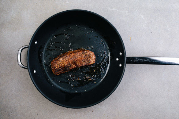 Das Fleisch in einer großen Pfanne mit 2EL Olivenöl bei starker Hitze auf jeder Seite 2–3Min. braten, abhängig davon, ob es medium oder eher durchgebraten sein soll. Währenddessen die Petersilienblätter abzupfen und fein hacken. Das Fleisch aus der Pfanne nehmen und bis zum Servieren auf einem Teller abgedeckt ruhen lassen.